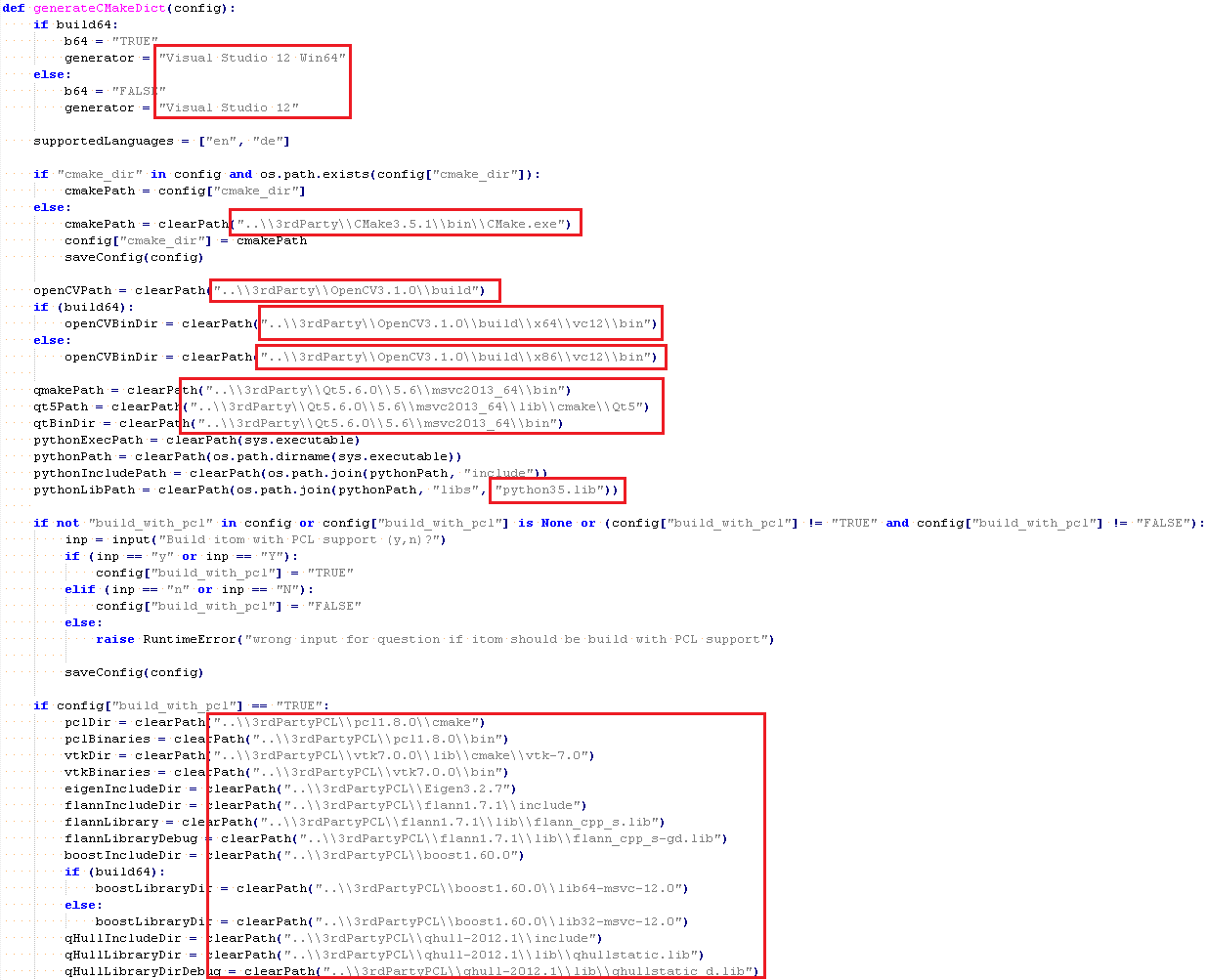Check in the function generateCMakeDict the version of Visual Studio and the paths of CMake, OpenCV, Python library version, VTK, PCL, Eigen, Flann, QHull.