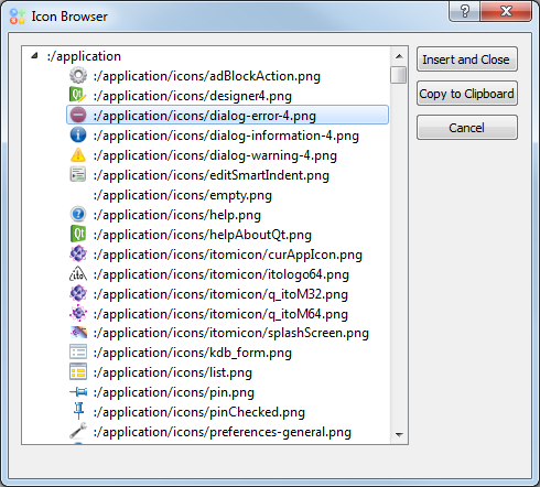 - Insert and close: The virtual icon path of the selected icon is inserted at the current cursor position in the script and the icon browser is closed.